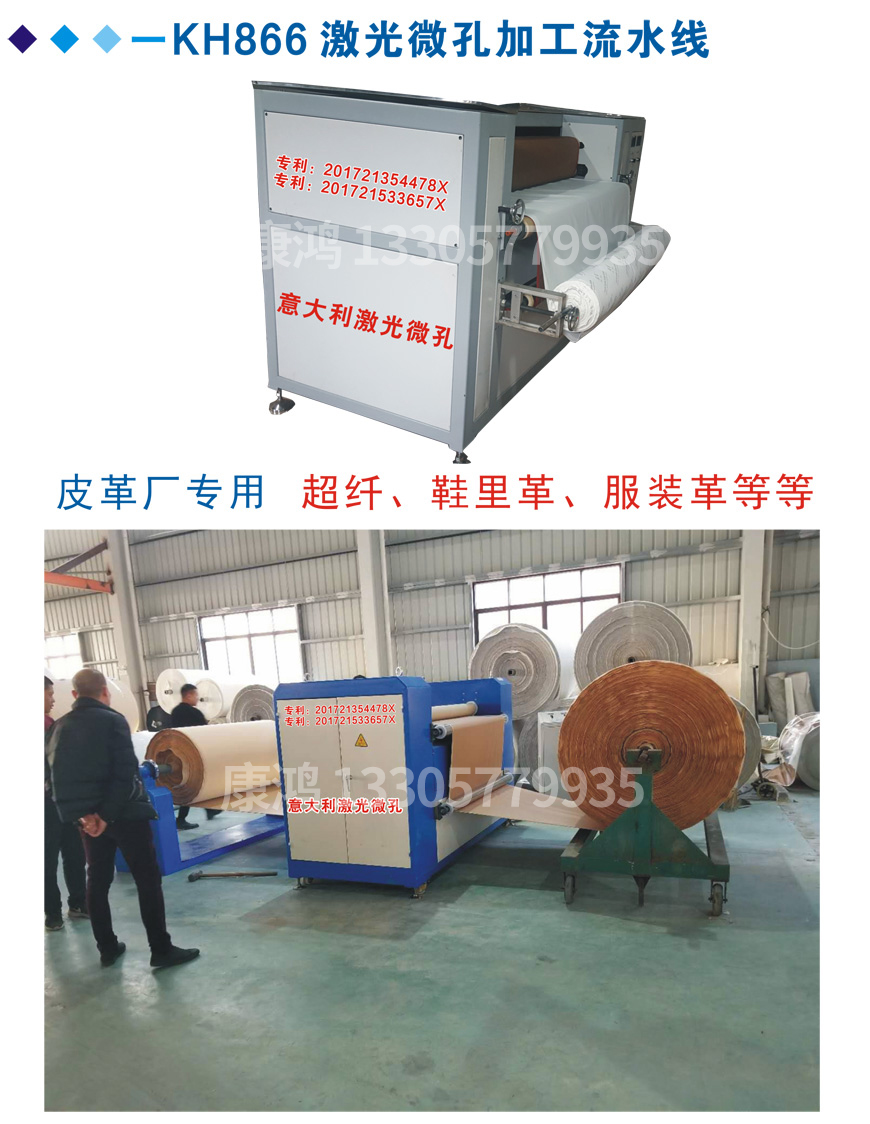 The application of Kanghong Microporous Technology in leather, synthetic leather products and raw materials has reached the maturity of technology with the unremitting efforts and research of recent young scientific and technological talents. Kanghong Microporous Technology uses the principle of laser combination and combines several types of rare precious metals Developed as a conductor. Kanghong Micropore Technology is currently specialized in the leather, synthetic leather products and raw materials industries. The leather, synthetic leather products and raw materials processed by this technology can achieve the effects of light transmission, water permeability and breathability. Kanghong microporous technology is currently used in all kinds of commonly used raw materials such as leather two layers below 4MM, PU leather, microfiber leather, space leather, film transfer leather, shoe leather. At present, according to different needs, the micropore hole diameter can be processed between 0.001mm-0.50mm, and the adjustable micropore density can be between 20-100 holes per square centimeter. The air permeability can be up to 10% variation. Peeling speed is 1~10m/min (adjustable).