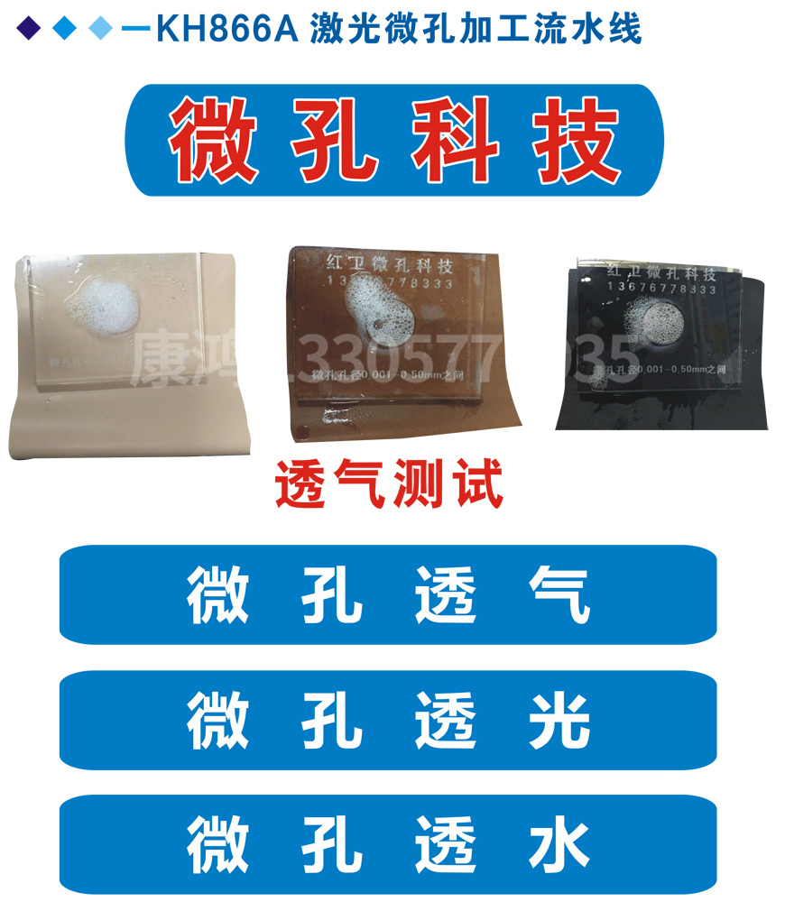 The application of Kanghong microporous technology in leather, synthetic leather products and raw materials has achieved technical maturity under the unremitting efforts and research of scientific and technical personnel in various fields in recent years; Kanghong microporous technology uses the principle of laser combination, and then combines several types of rare The precious metal was developed as a conductor. Kanghong Micropore Technology is currently specialized in the leather, synthetic leather products and raw materials industries. The leather, synthetic leather products and raw materials processed by this technology can achieve the effects of light transmission, water permeability and breathability. Kanghong microporous technology is currently used in all kinds of commonly used raw materials such as leather two layers below 4MM, PU leather, microfiber leather, space leather, film transfer leather, shoe leather. At present, according to different needs, the micropore diameter can be processed between 0.001MM-0.50MM, the adjustable micropore density is between 20-100 holes per square centimeter. The air permeability can be up to 10% variation.